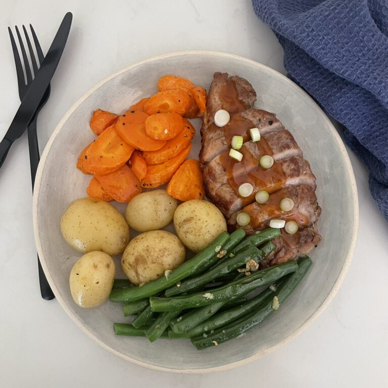 Sweet & Spicy Apricot Pork Steaks with Seasonal Veggies