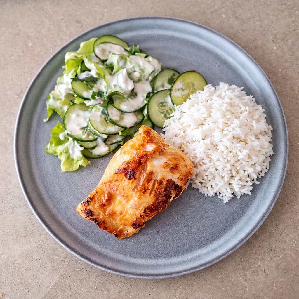 Market fish coated in a bold miso glaze and grilled until lightly charred and caramelised, served with fluffy rice and a crisp cucumber and lettuce salad tossed in creamy coconut dressing for a fresh, flavour-packed finish.