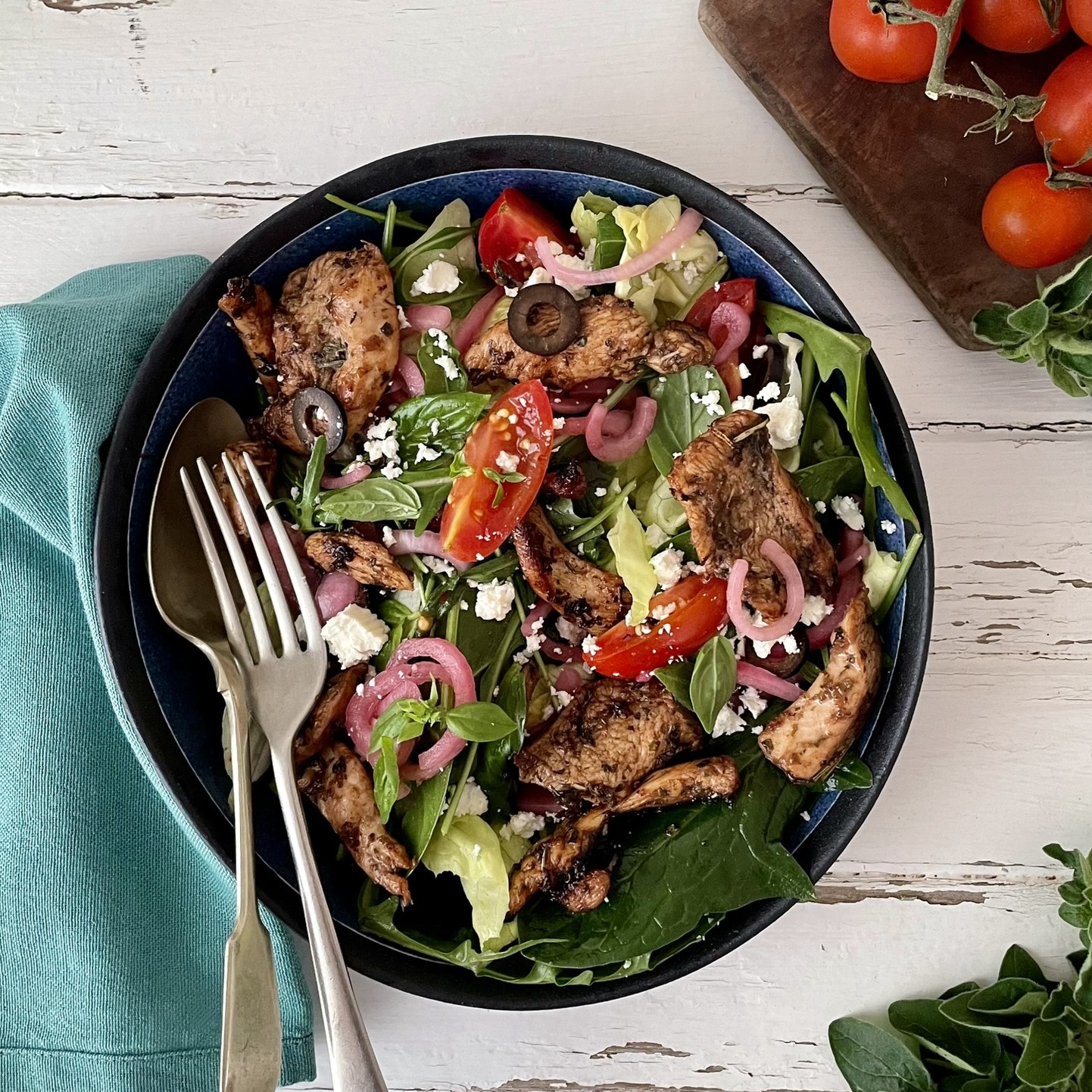 Succulent marinated chicken served over crisp salad leaves with sweet cherry tomatoes, tangy pickled red onion, briny olives and creamy feta, finished with a vibrant Mediterranean dressing.