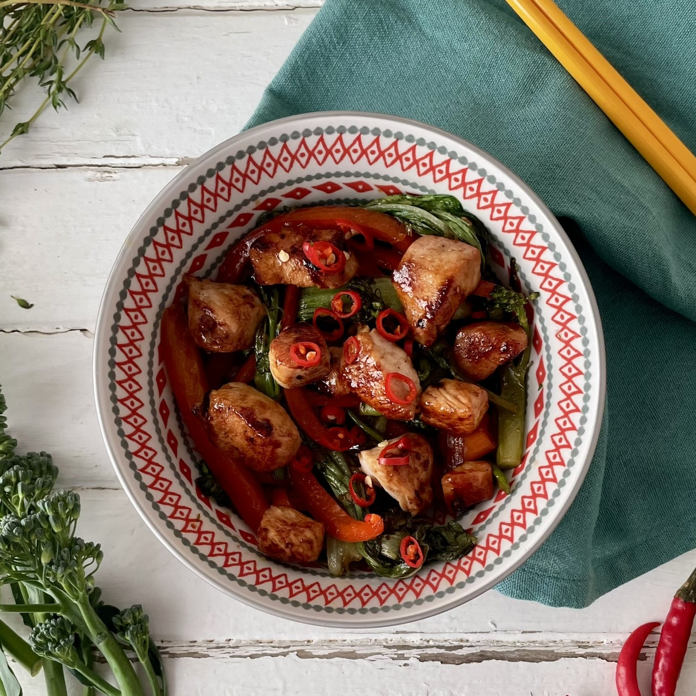Juicy chicken tossed with garlic, ginger and fresh chilli, stir-fried with crisp, tender stem broccoli, and red pepper in a savoury sesame chilli sauce.