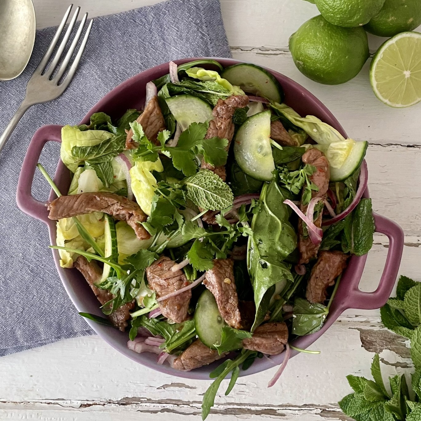 Tender beef strips tossed with crisp salad leaves, cool cucumber, red onion and fresh mint, finished with a punchy Nam Jim dressing and crunchy roasted peanuts.
