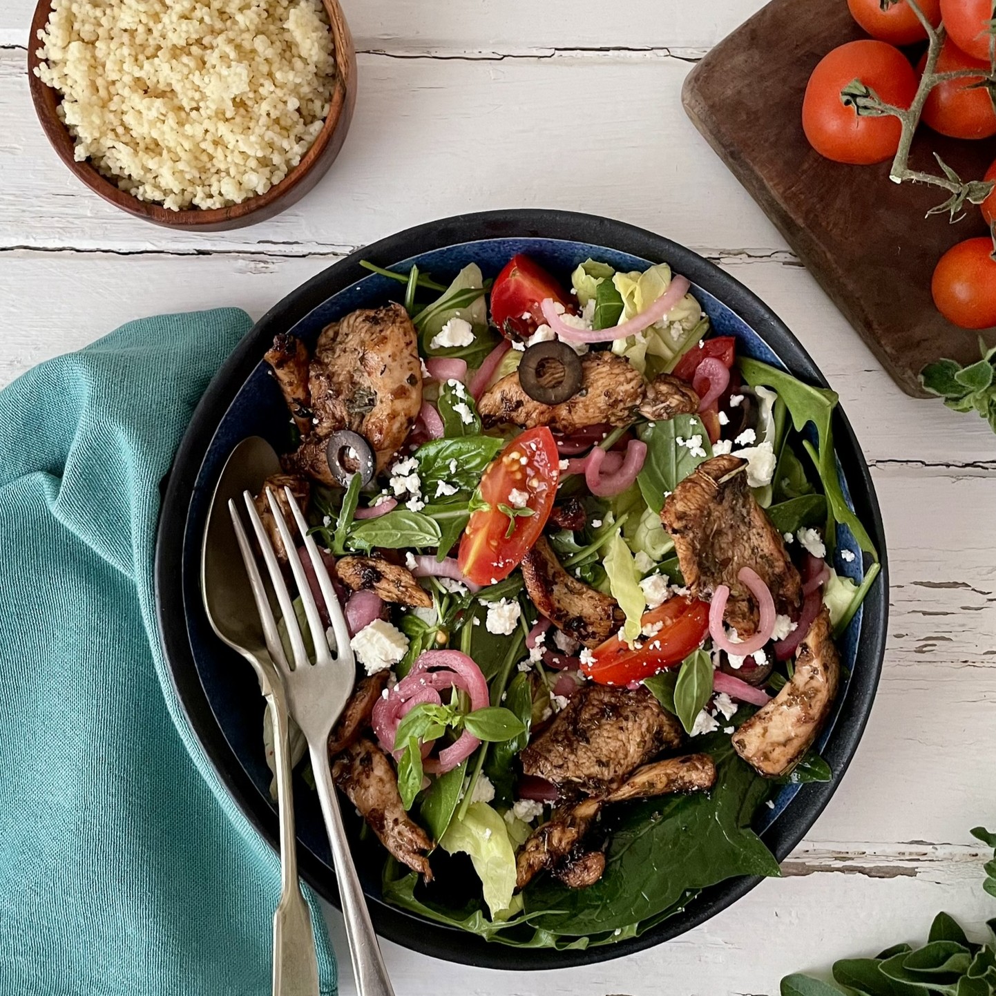 Succulent marinated chicken served over crisp salad leaves with sweet cherry tomatoes, tangy pickled red onion, briny olives and creamy feta, finished with a vibrant Mediterranean dressing.