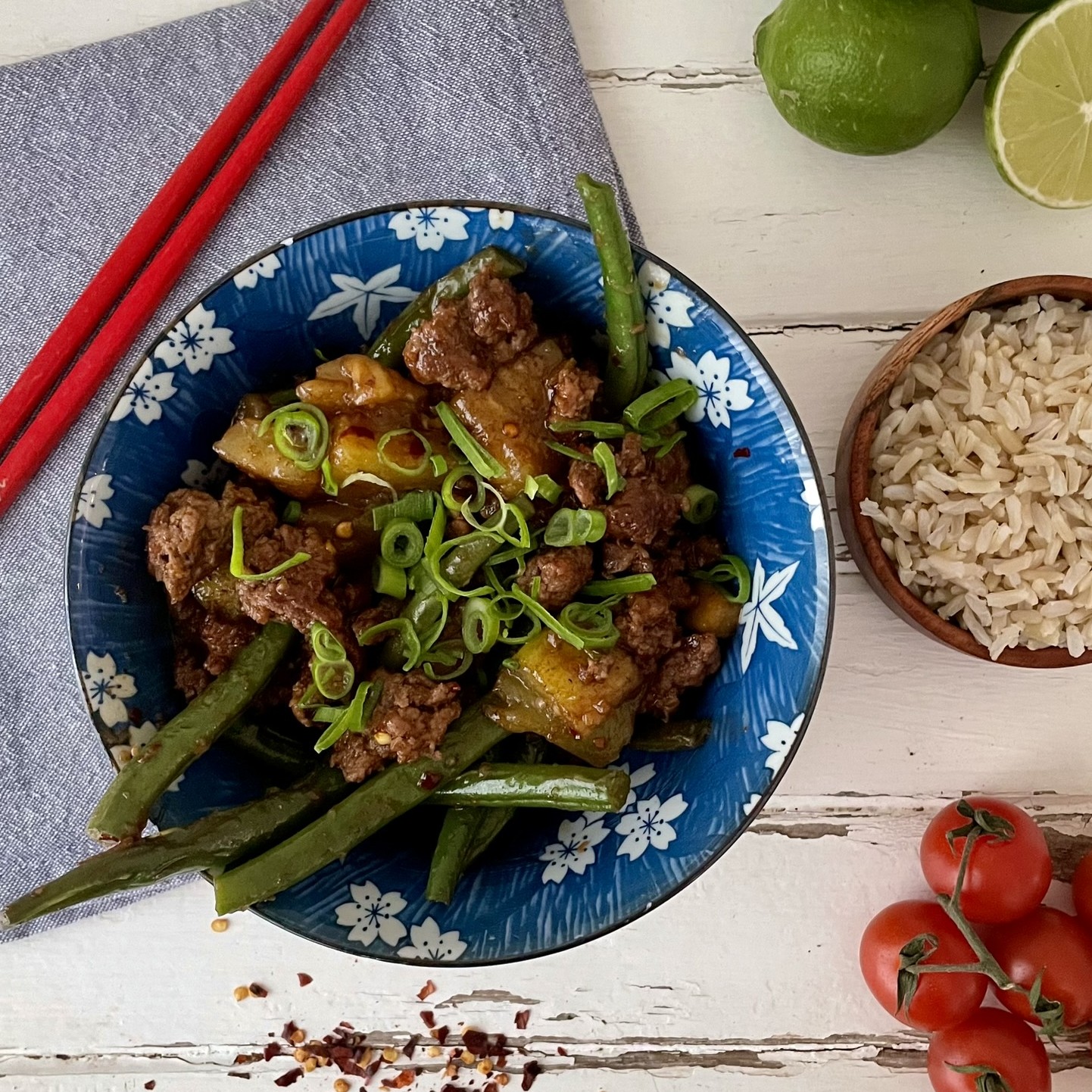 Spicy Pork & Aubergine Stir-Fry with Green Beans & Brown Rice