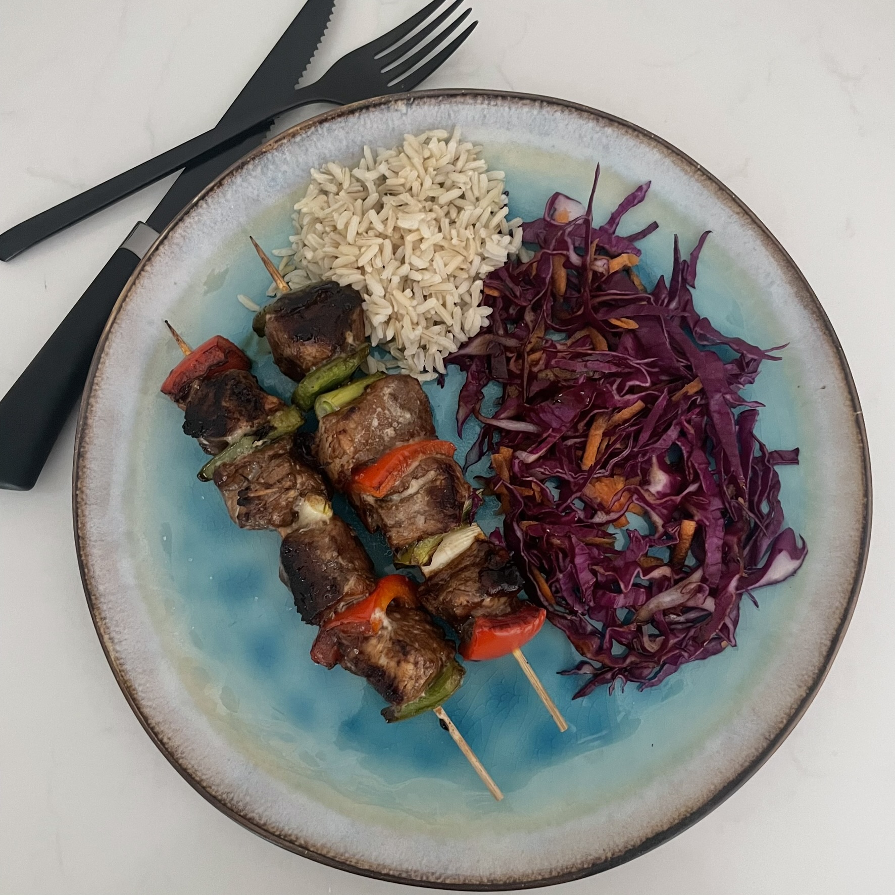 Balsamic Pork Kebabs, Crisp Slaw & Brown Rice