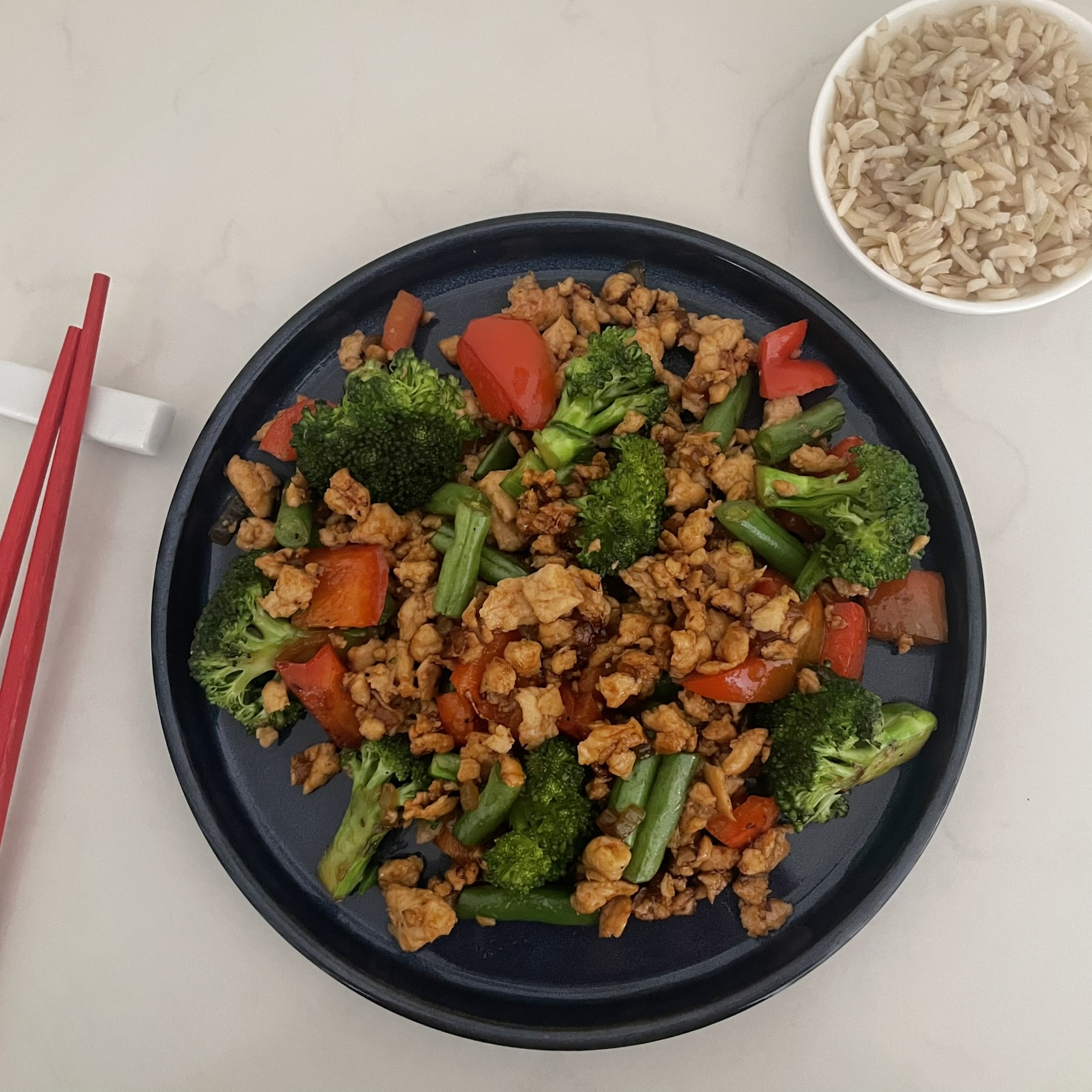 Tender chicken mince stir-fried with onion, red pepper, and green vegetables in a glossy sticky soy sauce, infused with fragrant garlic and ginger for a rich, flavourful finish.