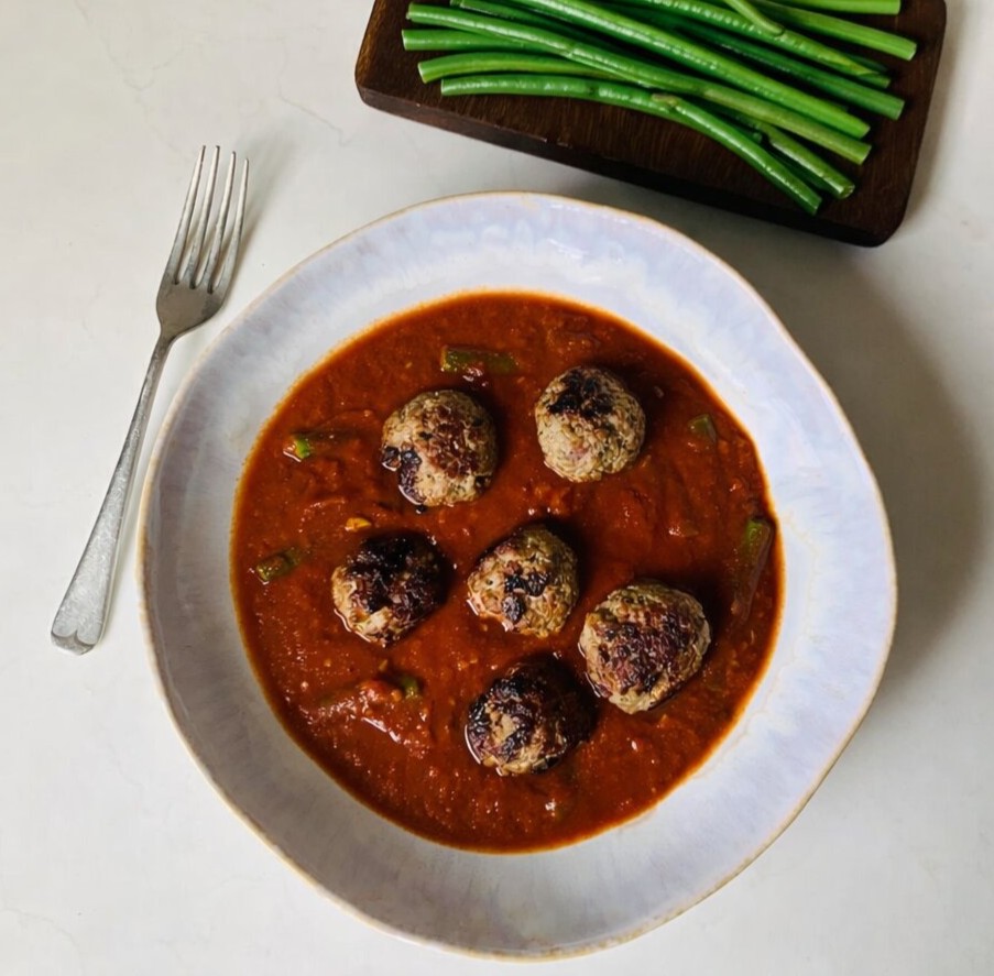 Juicy beef meatballs simmered in a rich tomato and red wine sauce with garlic and herbs, served with crisp green beans for a comforting, classic dish.