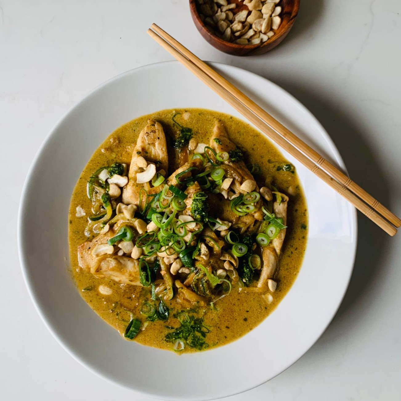 Tender chicken simmered in a creamy coconut and yellow curry sauce, finished with toasted cashews, fresh greens, and a hint of sesame for a rich, flavourful dish with a satisfying crunch.